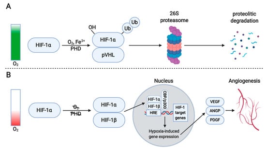The regulation of hypoxia-inducible factor 1α (HIF-1α) activity. (A) Under normoxic conditions, prolyl hydroxylase (PHD), in the presence of Fe2+ and an oxygen molecule, hydroxylates proline residues in the oxygen-dependent degradation domain of HIF-1α. This allows recognition and interaction with the von Hippel-Lindau (pVHL) E3 ubiquitin ligase leading to HIF-1α ubiquitination and subsequent degradation by 26S-proteasome. (B) Under hypoxic conditions, the hydroxylation and degradation of HIF-1α are blocked. Thus, HIF-1α can dimerize with HIF-1β, enter the nucleus and bind hypoxia response elements (HREs) within the promoters of target genes. Together with the co-activator proteins p300 and CBP, the HIF complex transcriptionally regulates the expression of its target genes such as VEGF, PDGF and ANGP, finally regulating many processes including angiogenesis. Created with BioRender.