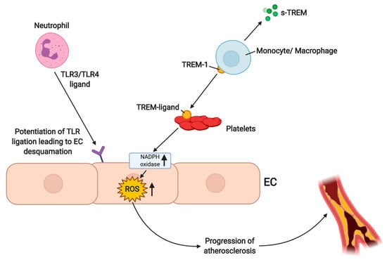 Neutrophils and monocytes/macrophages in peripheral artery disease (PAD). Neutrophils enhance the activation of monocytes via toll-like receptors (TLRs). TLRs are pattern recognition proteins, and their agonism leads to multiple important cellular mechanisms, like the generation of endoplasmic reticulum stress-ROS, and impairment of endothelial cell repair. Neutrophils potentiate TLR ligation leading to endothelial cell detachment and plaque erosion. Another mechanism indicating the role of neutrophils and monocytes/macrophages in oxidative stress shows that triggering receptors expressed on myeloid cells-1 (TREM-1), as an example of an inflammation marker, participate in the stimulation of these cells via interaction of TREM-ligand with TREM-1, which leads to an increased production of reactive oxygen species (ROS). Created with BioRender.