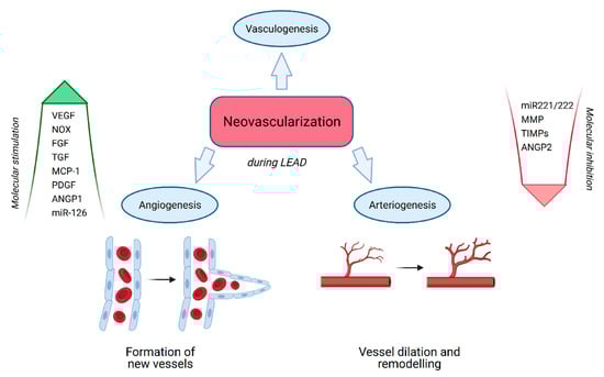 Neovascularization during LEAD. Angiogenesis, described as the process of new capillary formation from pre-existing capillary beds, and arteriogenesis, the process of vessel dilation and remodeling, can be distinguished during LEAD. The most important molecular factors described in this article that can stimulate or inhibit the neovascularization process are presented. Created with BioRender.