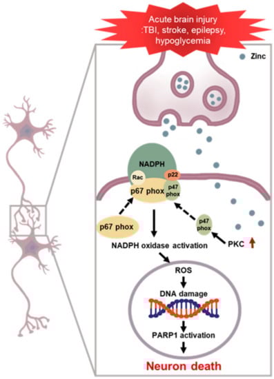 NADPH oxidase induced neuronal death after brain injury. Multiple acute neurological disorders lead to zinc release from the presynaptic neurons and translocation into the postsynaptic neurons, which, in turn, activates neuronal NOX. The p47phox component is phosphorylated and migrates to the plasma membrane, where it binds with other subunits to form an active enzyme complex. Activated NOX produces ROS, which is released into the intracellular or extracellular space and contributes to progressive DNA damage. ROS produced by NOX lead to further accumulation of zinc in the postsynaptic neurons, aggravating the cascades. PARP 1 is excessively activated due to DNA damage and leads to energy failure and mitochondrial dysfunction. This devastating cascade eventually leads to neuronal death.