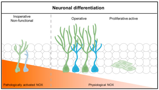Neuronal differentiation and function according to physiological NADPH oxidase (NOX) activity. Neuronal stem cells (NSCs) differentiate and function into neurons in a physiological or low NADPH oxidase environment. NOX in a physiological state causes lineage differentiation of neuronal stem cells (NSCs), but, under pathological conditions, neuronal stem cells (NSCs) do not differentiate well into neurons or function poorly.