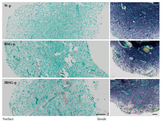 Brightfield microscopy analysis of pasta containing fermented and native brewers’ spent grain: BSG-p, pasta containing native brewers’ spent grain (15% wt/wt in replacement of semolina); fBSG-p, pasta containing fermented brewers’ spent grain (15% wt/wt in replacement of semolina); W-p, pasta made with durum wheat semolina. Proteins are shown in green and starch is shown in blue. Fibers are unstained. Scale bar left panel 200 µm and right panel 100 µm.
