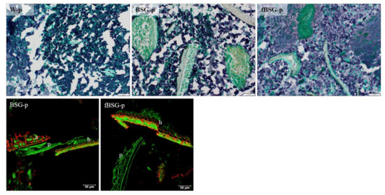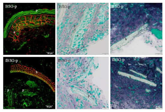 Brightfield and CLSM microscopy analysis performed on the in vitro-digested pasta containing fermented and native brewers’ spent grain: BSG-p, pasta containing native brewers’ spent grain; fBSG-p, pasta containing fermented brewers’ spent grain. W-p, pasta made with durum wheat semolina. Upper row: Bright field micrographs. Proteins are stained green and starch is stained blue. Scale bar 100 µm. Lower row: CLSM micrographs. Arabinoxylan is shown in red and autofluorescence (cell walls, protein) in green. h = hull (palea and lemma), a = aleurone, p = pericarp. Scale bars 50 µm.