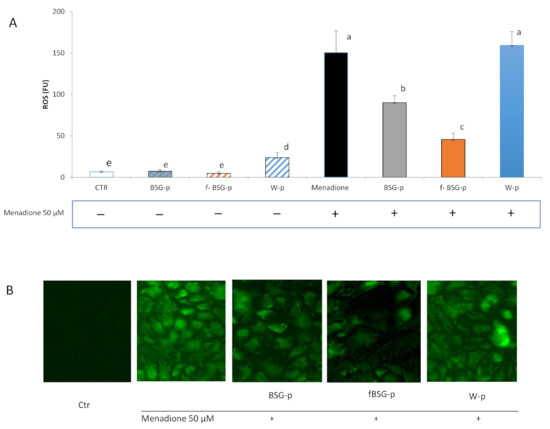 The assessment of the level of ROS was carried out by measuring the oxidation of the Cell Rox green probe (Thermofisher scientific, USA). Briefly, the confluent Caco-2 cells in the 96-well plates underwent pre-treatment for 18 h with freeze-dried digested pasta samples (100 µg/mL). Menadione (50 µM) was added 2 h before the end of the incubation to induce oxidative stress. Then, cells were stained with 5 µM of Cell Rox green probe and were incubated for 30 min at 37 °C. After washing with PBS, cells were fixed in 3.7% formaldehyde/PBS and permeabilized with 0.5% Triton X-100 for 15 min and analysed by fluorescent microscopy FLoid™ Cell Imaging Station. The fluorescence intensity (relative fluorescence units) was measured (Spectrofluorimeter Victor3, Perkin-Elmer, Waltham, MA, USA) at an excitation and emission wavelength of 485 nm and 520 nm, respectively.