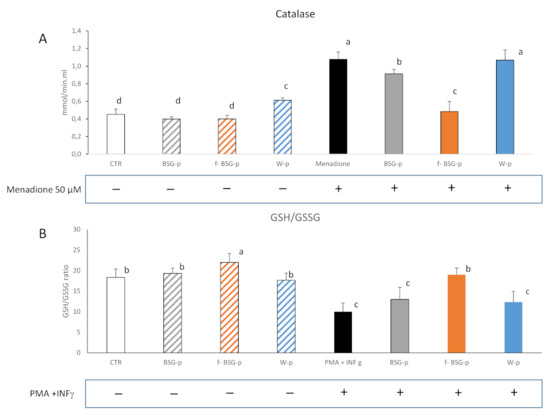 The capability of fBSG-p to protect from oxidative stress was demonstrated on human colon carcinoma cells (Caco-2), widely used as in vitro model of the intestinal mucosa. Intestinal cells are extremely susceptible to oxidative injury when exposed to lipid peroxidation products and luminal oxidants derived by food ingestion [68]. Under the experiment conditions, in which an oxidative stress was artificially induced, the treatment with digested fBSG-p significantly decreased the generation of intracellular ROS, even though BSG-p also conferred a relevant effect in ROS reduction. It can be hypothesized that the enhanced biological availability of phenolic compounds increased the scavenging capacity of the cell culture system and lowered the catalase activity. Indeed, the lowest catalase activity was detected in cells subjected to the treatment with fBSG-p. A further confirmation of the scavenging capacity exerted by fBSG-p on Caco-2 cells was provided by the increased ratio of reduced to oxidized glutathione compared to the other treatments. GSH represents a marker of oxidative stress in inflammatory diseases. It is involved in ROS detoxification and therefore its increase corresponds to an effective limitation of the cellular oxidative damage [69].