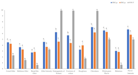 Generally, fermentation has an important role in improving sensory characteristics [50]. Descriptive analysis is generally used when detailed specification of sensory attributes in products for their comparison is desired [39]. Cereal/malt odor and the bitterness were chosen as sensory attributes to describe the characteristics of BSG. Being the fibers largely responsible of the sensory and technological properties of the BSG containing pasta, a commercial wholewheat pasta containing 7% of fibers was included as control. Previous results reported a good acceptability of pasta supplemented with native BSG at percentages lower than 20% [44]. In this work, we demonstrated that fermentation of BSG allowed higher perceived homogeneity, chewiness, and roughness of the pasta, conferring a more intense odor, compared to the use of untreated BSG.
