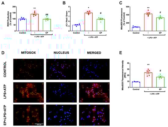 3.4. EP Ameliorated ROS Production and Restored Mitochondrial Membrane Potential
