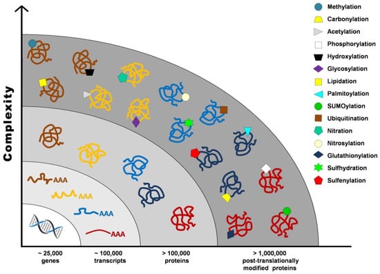 Proteome once defined as the “protein complement of the genome” cannot be accurately established without taking into account post-translational modifications (PTMs), such as proteolysis, phosphorylation, glycosylation, glutathionylation, S-nitrosylation, and carbonylation, that contribute to the vast number of gene products from a single transcript. It has been estimated that the human genome contains between 20,000 and 25,000 genes, whereas the transcriptome is composed of around 100,000 transcripts, and the proteome exceeds 1 million proteins (Figure 1) [1].