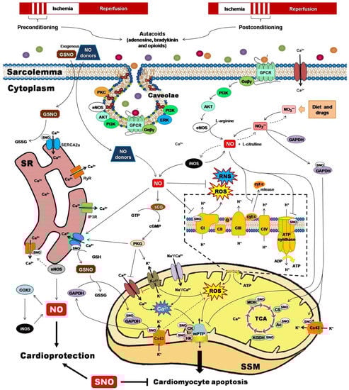 Substantial progress has been made in understanding how redox PTMs modulate important cellular functions in cardiac physiopathology, highlighting the paramount role of redox homeostasis. NO and its derivatives are fundamental in IPC- and iPostC-induced cardioprotection, whereas reversible SNO of mitochondrial proteins is crucial for preventing structural and functional changes of ROS/RNS-modified proteins. Downstream signaling pathways that reduce Ca2+ overload, prevent mPTP opening, and attenuate cell death point out the central role of mitochondria in both cardioprotective maneuvers. The intricate network of mitochondrial SNO proteins involved in these mechanisms requires further studies to elucidate the impact of such post-translational modifications on mitophagy, fusion/fission processes, and proteasomal degradation in the setting of acute myocardial infarction. In addition, recognition of the relevance of caveolae on NO signal delivery to mitochondria further addresses the physiological and pathological importance of these modifications in heart disease and may be a potential therapeutic target for preventing and/or treating reperfusion damage.