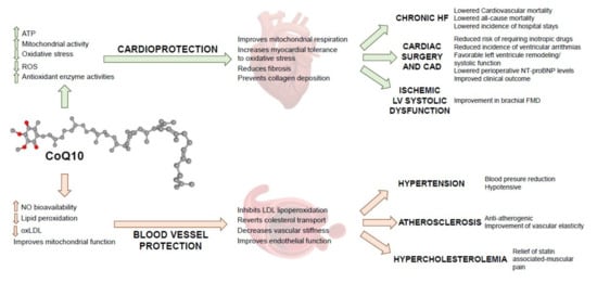 CoQ10 is an endogenous antioxidant produced in all cells that plays an essential role in energy metabolism and antioxidant protection. CoQ10 distribution is not uniform among different organs, and the highest concentration is observed in the heart, though its levels decrease with age. Advanced age is the major risk factor for cardiovascular disease and endothelial dysfunction triggered by oxidative stress that impairs mitochondrial bioenergetic and reduces NO bioavailability, thus affecting vasodilatation. The rationale of the use of CoQ10 in cardiovascular diseases is that the loss of contractile function due to an energy depletion status in the mitochondria and reduced levels of NO for vasodilatation has been associated with low endogenous CoQ10 levels. Clinical evidence shows that CoQ10 supplementation for prolonged periods is safe, well-tolerated and significantly increases the concentration of CoQ10 in plasma up to 3–5 µg/mL. CoQ10 supplementation reduces oxidative stress and mortality from cardiovascular causes and improves clinical outcome in patients undergoing coronary artery bypass graft surgery, prevents the accumulation of oxLDL in arteries, decreases vascular stiffness and hypertension, improves endothelial dysfunction by reducing the source of ROS in the vascular system and increases the NO levels for vasodilation.