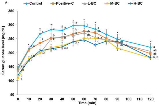 OGTT results showed that peak serum glucose concentrations at 50 to 60 min were highest in the control group and, in descending order, glucose concentrations followed the pattern control > positive-C = L-BC > M-BC = H-BC (Figure 2A). The time of peak serum glucose concentrations was delayed in all groups, especially in the control group, suggesting that all rats had insulin resistance and lower insulin secretion, and BC intake partially improved the delay of peak glucose. A delay in peak serum glucose concentration indicates a decrease in insulin sensitivity and secretion, and the rats in the control group had the greatest impairment of glucose homeostasis [35]. After peaking, serum glucose concentrations decreased in all groups in the order control > L-BC > positive-C > M-BC = H-BC (Figure 2A). The AUC of serum glucose 0 to 50 min after glucose administration was higher in the control group than in the positive-C group and was reduced in the order of L-BC > M-BC = H-BC (Figure 2B). BC also similarly reduced the AUCs of serum glucose from 60 to 120 min, although decreases were more marked between 0 and 50 min (Figure 2B). OGTT results in the M-BC and H-BC groups were similar.