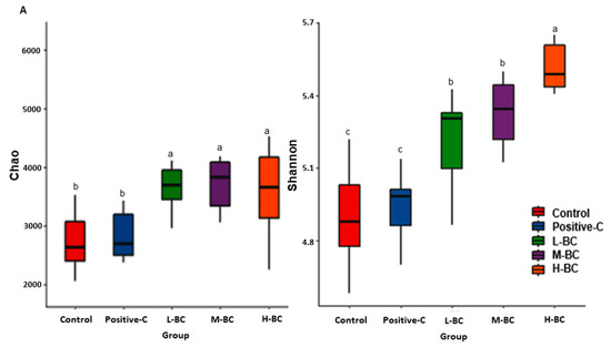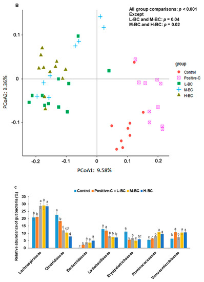 α-diversity is a quantitative assessment of the number of bacterial species present and in the present study it was determined using chao1 and Shannon indexes. These two indexes were similar in the control and the positive-C groups but higher in the BC groups than in the control group (Figure 6A). According to Shannon indexes, α-diversity dose-dependently increased with BC (p < 0.05; Figure 6A). Principle coordinate analysis (PCoA) showed β-diversity of the gut microbiome: fecal bacterial communities formed well-separated clusters in the five study groups (Figure 6B). The control group was clearly separated from the positive-C and BC groups (p < 0.001). BC groups formed a large cluster (p < 0.001), though each group was clustered into subgroups according to the dosages of BC (Figure 6B). These results indicate that α- and β-diversities were improved in the BC groups compared to the control group. However, those of the control and positive-C groups were not significantly different.