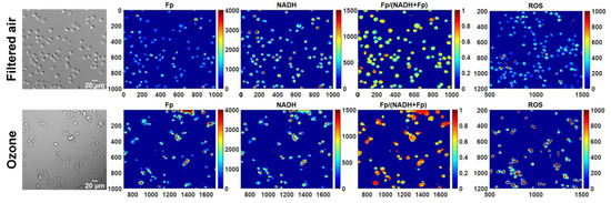 Quantification of redox imaging data shows a significant NAD(H) redox alteration due to ozone exposure. AM from ozone-exposed mice had an increased Fp value (by 31% increase, p = 0.017), no significant change in NADH, and a higher redox ratio (by 9%, p = 0.010) (Figure 2A–C), indicating that the cells were in a more oxidized redox state than those of FA exposure. Overall, these results are consistent with our previous findings in fresh AM [5].