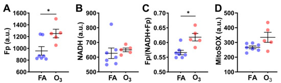 O3 induced significant changes in the NAD(H) redox status of cryopreserved AM compared to filtered air (FA). Each dot represents an AM sample from one mouse. (A) Significant increase in Fp; (B) no significant changes in NADH; (C) significant increase in the redox ratio; (D) no significant difference in mitochondrial ROS level despite a trend of increase induced by O3 (data shown as mean ± SD). * p < 0.05.