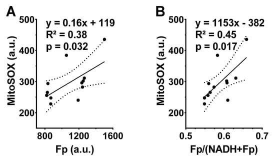 The redox indices Fp and the redox ratio positively correlate with the mitochondrial ROS levels in cryopreserved AM. Each dot represents an AM sample from one mouse, where dashed curves correspond to 95% confidence intervals. (A) Higher Fp value significantly correlates with higher ROS level; (B) higher redox ratio significantly correlates with higher ROS level.