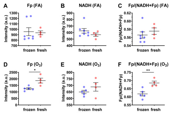 Comparisons of the redox indices between cryopreserved/frozen AM and fresh AM. Each dot represents an AM sample from one mouse. (A–C) Under FA exposure, there is no significant redox difference between cryopreserved/frozen AM and fresh AM; (D–F) under O3 exposure, fresh AM were in a more oxidized redox state with significantly higher Fp values (D) and significantly higher redox ratios (F) (mean ± SD). * p < 0.05 and ** p < 0.01.