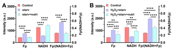 To confirm our suspicion, we simulated the nutrient starvation and replenishing processes in a mouse alveolar cell line. The cells were nutrient-starved for 2.5 h in 2 °C. It is known that glucose-starvation results in a more oxidized redox state compared to glucose supplementation [12,13,14]. As expected, we observed that nutrient starvation resulted in a significantly higher Fp (by 75%, p < 0.0001), lower NADH (by 56%, p < 0.0001), and a higher redox ratio (by 110%, p < 0.0001) compared to the control, whereas replenishing the cells with 11 mM glucose and 2 mM glutamine immediately fully restored the NAD(H) redox status (Figure 5A). The three redox indices, Fp, NADH, and the redox ratio, all went back to their original values. In contrast, when the cells were first exposed to 135 µM hydrogen peroxide (H2O2) for 0.5 h followed by rinsing off the H2O2, then underwent nutrient starvation for 2.5 h in 2 °C, the same nutritional replenishment only partially restored the redox status despite that the H2O2 was removed (Figure 5B). Specifically, the hydrogen peroxide-induced oxidative stress plus the nutrient starvation resulted in a 142% Fp increase (p < 0.0001), a 67% NADH decrease (p < 0.0001), and a 147% increase in the redox ratio (p < 0.0001). Apparently, the oxidative stress plus nutrient starvation shifted the cells to a much more oxidized state than nutrient starvation alone. Upon nutrient supplementation, neither Fp nor NADH went back to their original values, and the redox ratio stayed at 0.41 ± 0.034, which is significantly different from the original 0.26 ± 0.013 (p < 0.0001). This indicates that exogenous H2O2-induced oxidative stress profoundly affected an alveolar macrophage’s capacity to regain its redox status upon nutritional replenishment.