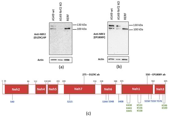 Nrf2 migratory pattern detected in A549 wt, A549 Nrf2 KO, and RERF cells with two monoclonal antibodies—Cell Signaling (CS) (D1Z9C) (a) and Abcam [EP1808Y] (b), (c) Domain structure of Nrf2 with post-translational modifications and regions recognized by Cell Signaling (CS) (D1Z9C) and Abcam [EP1808Y] antibodies. Precise epitope sequence is disclosed, for Abcam EP1808Y it is known to be localized in the C-terminus, surrounding 550 aa and for CS—in the proximity of 275 Ala. Post-translational modifications of Nrf2 residues are marked—phosphorylation in blue (Ser40, Ser215, Ser344, Ser348, Ser408, Ser558, Thr559, and Tyr576) and acetylation in green (Lys438, Lys443, Lys445, Lys533, Lys536, Lys538, Lys596, and Lys599).