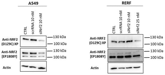 Nrf2 knockdown in A549 and RERF cells detected by two different monoclonal antibodies. Nrf2 expression was silenced with Nrf2-targeting siRNAs for 48 h: 10 nM (A549) and 10 nM and 25 nM (RERF). Nrf2 signal was detected with two monoclonal antibodies: Cell Signaling (D1Z9C) and Abcam [EP1808Y]. Actin was used as a loading control. scrRNA is a control unspecific siRNA.