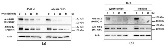 Nrf2 after translation inhibition. (a) Western blot analysis of A549 wt and A549 Nrf2 KO cells after treatment with translation inhibitors cycloheximide (chx) at different time points (8, 16, and 24 h). Nrf2 was detected using Cell Signaling (D1Z9C) and Abcam [EP1808Y] antibodies. (b) Western blot analysis of RERF cells after treatment with translation inhibitors cycloheximide (chx) and emetine at different time points (8, 16, and 24 h). Nrf2 was detected using Cell Signaling (D1Z9C) and Abcam [EP1808Y] antibodies.