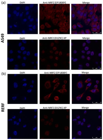 Cellular Nrf2 localization detected with Nrf2-specific monoclonal antibodies EP1808Y and D1Z9C in A549 (a) and RERF (b) cells. After fixation, cells were stained with Abcam (EP1808Y) and Cell Signaling (D1Z9C) antibodies followed by Alexa Fluor 488 goat anti-rabbit secondary antibodies. Nuclei were stained with DAPI.