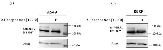 The question that arises here, is what is the source of these two distinct Nrf2 forms. One option is the post-translational modifications of Nrf2 that could account for differences in mass and stability of the two forms. Phosphorylation is the predominant Nrf2 modification and various Nrf2 residues are phosphorylated, including Ser40, Ser215, Ser344, Ser347, Ser408, Ser558, Thr559, and Tyr576 (Figure 1) [33,34,35,36,37]. Their impact on Nrf2 stability and activity can be different and is thought to depend on the phosphorylation site. Thus we have asked if two Nrf2 forms detected with Abcam EP1808Y antibodies are the phosphorylated and dephosphorylated Nrf2 forms. We made use of lambda protein phosphatase (λPP), which removes phosphate groups from phosphorylated serine, threonine and tyrosine residues and observed that in both A549 and RERF cells the heavier upper band is affected by λPP treatment, but the lower 105 kDa band is not (Figure 7). Interestingly, after λ phosphatase, the molecular weight of the upper Nrf2 form was reduced to ~110 kDa, which is visible as a band migrating just above the abundant 105 kDa Nrf2. It indicates that the 105 kDa Nrf2 is not simply a dephosphorylated Nrf2, but rather a shorter Nrf2 form.