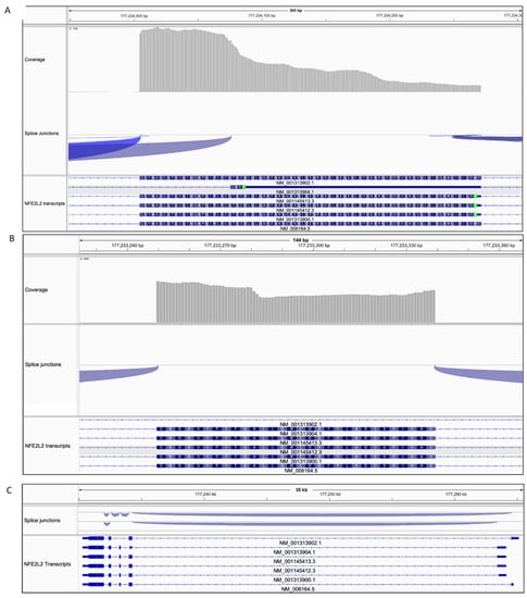 Expression of different NFE2L2 transcripts in A549 cells based on RNA sequencing data. (A) Visualization of sequence reads alignments within exon 2. Beginning of the exon 2 is on the right-hand and the end on the left-hand side. Splice junctions are represented by arches. Apart from classical junctions at the beginning and the end of the exon, in a portion of reads the 3’ end of exon 2 was spliced out. These reads have been aligned to the transcript NM_001313904.1 (transcripts references are below each transcript). Transcripts sequence within the exon was translated to the encoded amino acids (B) Visualization of sequence reads alignments within exon 3. In the transcript NM_001313902.1 exon 3 is spliced out. (C) Visualization of all the transcripts (6) identified in A549 cells. Exon 1 is on the right-hand and exon 5 on the left-hand side. Assembly of RNA-Seq alignments into potential transcripts together with calculation of expression levels for those transcripts were performed with StringTie software [20]. Visualization of the alignments identified transcripts and junctions was performed in IGV software [21].