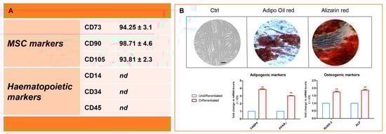 Human Gingival Mesenchymal Stem Cells (hGMSCs) characterization. (A) Antigen expression quantification by flow cytometry in human Gingival Mesenchymal Stem Cells (hGMSCs). Cells do not express hematopoietic antigens CD14, CD34 and CD45 and co-express CD73, CD90 and CD105. (B) Differentiation assay: cultured hGMSCs were induced to differentiate into adipocytes and osteoblast. Adipogenic differentiation was demonstrated by lipid vacuole detection with the lipid adipo oil red staining; and calcium deposits in the osteoblast differentiation were detected with alizarin red staining. Graph bars showed the expression of specific markers in cells undergoing adipogenic and osteogenic differentiation. Results represent three independent experiments performed in triplicate (n = 3). MSC: mesenchymal stem cell; nd: not detectable; FABP4: fatty acid-binding protein 4; PPARγ: peroxisome proliferator-activated receptor γ; RUNX-2: Runt-related transcription factor-2; ALP: alkaline phosphatase. Scale bar: 20 µm. ** p < 0.01.