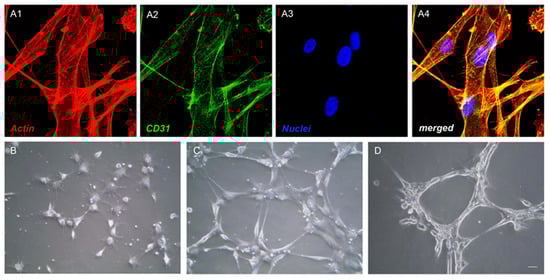 An evaluation of the impact of the differentiation medium kit exposure on hGMSCs to induce the endothelial transition (e-hGMSCs) was performed by examining the typical endothelial markers using CD31 immunofluorescence via staining. As reported, differentiated cells showed the expression of CD31 observed under confocal laser scanning microscopy (Figure 2A1–A4). Results of the tube formation assay showed that a number of capillary-like structures were observed after 24 h of differentiation induction (Figure 2B–D).