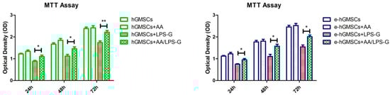 At defined time points, 24, 48 and 72 h after cultivation in all considered culture conditions hGMSCs, the cell metabolic activity was evaluated. Human GMSC and e-hGMSC cell metabolic activity was reduced when treated with LPS-G compared to the untreated cells. Conversely, constant cell numbers were recorded in the untreated and AA-treated groups. In addition, cells co-treated with AA and LPS-G showed a better trend in cell metabolic activity at all considered end points (Figure 3).