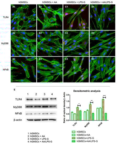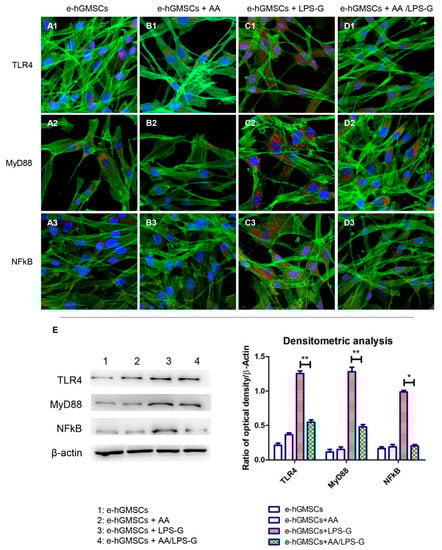 TLR4/MyD88/NFκB signaling pathway and differences in protein levels in e-hGMSCs. Expression of TLR4, MYD88 and NFκB, examined by confocal microscopy and Western blot experiments. (A1–D1) TLR4 expression in e-hGMSCs (CTRL), e-hGMSCs + AA, e-hGMSCs + LPS-G, e-hGMSCs + AA/LPS-G. (A2–D2) MyD88 expression in e-hGMSCs (CTRL), e-hGMSCs + AA, e-hGMSCs + LPS-G, e-hGMSCs + AA/LPS-G. (A3–D3) NFκB expression in e-hGMSCs (CTRL), e-hGMSCs + AA, e-hGMSCs + LPS-G, e-hGMSCs + AA/LPS-G. (E) TLR4, MyD88 and NFκB protein levels. β-actin was used as a loading control. Green fluorescence: cytoskeleton actin. Red fluorescence: TLR4, MYD88, NFκB. Blue fluorescence: cell nuclei. Scale bar: 20 µm. * p < 0.05; ** p < 0.01.