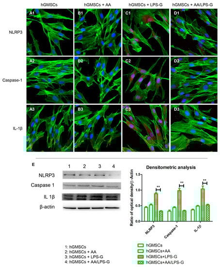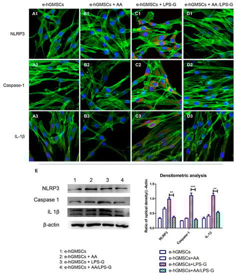 NLRP3/Caspase-1/IL-1β signaling pathway and differences in protein levels in e-hGMSCs. Expression of NLRP3, Caspase-1 and IL-1β, examined by confocal microscopy and Western blot experiments. (A1–D1) NLRP3 expression in e-hGMSCs (CTRL), e-hGMSCs + AA, e-hGMSCs + LPS-G, e-hGMSCs + AA/LPS-G. (A2–D2) Caspase-1 expression in e-hGMSCs (CTRL), e-hGMSCs + AA, e-hGMSCs + LPS-G, e-hGMSCs + AA/LPS-G. (A3–D3) IL-1β expression in e-hGMSCs (CTRL), e-hGMSCs + AA, e-hGMSCs + LPS-G, e-hGMSCs + AA/LPS-G. (E) NLRP3, Caspase-1 and IL-1β protein levels. β-actin was used as a loading control. Green fluorescence: cytoskeleton actin. Red fluorescence: NLRP3, Caspase-1, IL-1β. Blue fluorescence: cell nuclei. Scale bar: 20 µm. ** p < 0.01; *** p < 0.001.