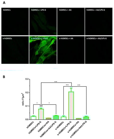 ROS production induced by LPS-G has been studied in hGMSCs and e-hGMSCs loaded with the cell-permeant H2DCFDA. Once penetrated inside the cell, the cleavage of the acetate groups by intracellular esterases makes the molecule active and able to undergo oxidation. In this way, the nonfluorescent H2DCFDA is converted to the highly fluorescent 2′,7′-dichlorofluorescein (DCF) by ROS. Images were acquired in live cells by means of confocal microscopy as reported in Figure 8A and the single cells’ fluorescence recorded was analyzed offline. Quantitative results (Figure 8B) showed a significative increase in ROS production both in 5 µg mL−1 LPS-G-treated hGMSCs and e-hGMSCs vs. the control condition (hGMSCs and e-hGMSCs, respectively). Interestingly, the co-incubation of LPS-G together with AA counteracted the LPS-G increase in ROS production. Of note, comparing the results obtained in the hGMSCs and e-hGMSCs LPS-G-treated cells, we observed that the latter were more prone to produce ROS.
