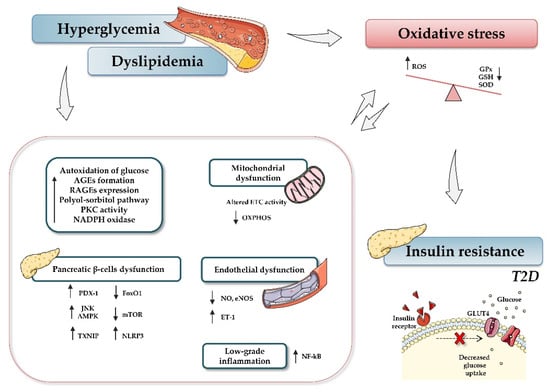 Relationship between type 2 diabetes and oxidative stress. Hyperglycemia, dyslipidemia, and insulin resistance play key roles in oxidative stress and diabetes development. Briefly, increased glucose levels promote different mechanisms, such as autoxidation of glucose, accumulation of advanced glycation-end products (AGE) and nitric oxide (NO), activation of diacylglycerol (DAG), activation of polyol-sorbitol pathway, and an increase in protein kinase C (PKC), which, in turn, lead to the generation of oxidative stress, impairment of mitochondrial function, and induction of inflammatory events. The figure summarizes the most relevant involved processes and signaling pathways. Up and down arrows indicate an increase and decrease, respectively. Abbreviations: AGEs, advanced glycation-end products; AMPK, AMP-activated protein kinase; ETC, electron transport chain; FoxO1, Forkhead box protein O1; GPx, glutathione peroxidase; GSH, reduced glutathione; NADPH, nicotinamide adenine dinucleotide phosphate; NF-кB, nuclear factor kappa-light-chain-enhancer of activated B cells; NO, nitric oxide; eNOS, endothelial nitric oxide synthase; mTOR, mammalian target of rapamycin; NLRP3, (nucleotide oligomerization domain (NOD), leucine-rich repeat (LRR) and pyrin domain (PYD)); OXPHOS, oxidative phosphorylation system; PDX-1, pancreatic and duodenal homeobox 1; PKC, protein kinase C; RAGEs, receptor for AGEs; ROS, reactive oxygen species; SOD, dismutase; JNK, c-Jun N-terminal kinase; T2D, type 2 diabetes; TXNIP, thioredoxin-interacting protein.