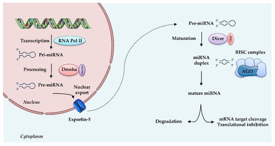 MiRNAs are small (20–25 nt) non-coding, single stranded RNAs that inhibit gene expression at the transcriptional or post-transcriptional level. They are known to target multiple genes, and, conversely, genes are targeted by multiple miRNAs, thus allowing many levels of regulation of gene expression. MiRNAs originate from a double-stranded RNA transcript folded in a hairpin structure, known as pre-miRNA precursor molecules. The canonical biogenesis of miRNAs requires two central steps; in the nucleus, the enzyme Drosha, in association with the double-stranded RNA-binding protein DGCR8, crops pre-miRNA to a 70-nucleotide (nt) pre-miRNA, which is then transported to the cytosol. There, pre-miRNA undergoes further processing by the Dicer-TRBP (transactivation-responsive RNA-binding protein) complex into a miRNA duplex approximately 20 nt long, with a 3′- strand and a 5′- terminus strand. Although both arms can become functional, one strand is typically degraded and the other is selected as mature miRNA, depending on the cell type or the tissue. Subsequently, this single-stranded miRNA directly interacts with proteins of the Argonaute (AGO) family, components of “miRNA-induced silencing complexes” (miRISCs). These effector complexes promote mRNA deadenylation, translational repression or endonucleolytic cleavage of highly complementary targets, and exonucleolytic decay of partially complementary ones []. Besides this canonical miRNA biogenesis, illustrated in Figure 2, an alternative non-canonical pathway that bypasses Drosha or Dicer processing has been described []. miRISC, through sequence-specific binding to the UTR of target mRNAs, is able to guide the miRNA to the specific target, thus interfering with translational initiation factors and translation and protein synthesis, as well as blocking translation post-initiation [].