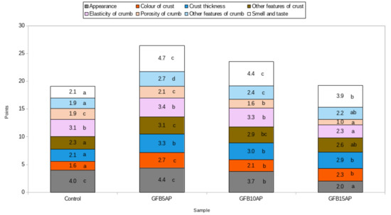 Organoleptic evaluation of gluten-free breads with apple pomace (values signed the same letters a–d in particular colors are not significant at 0.05 level of confidence).
