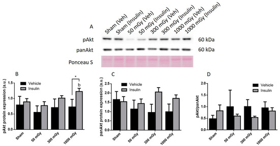 Representative western blot (A) and quantified band density (relative protein expression in arbitrary units) for phosphorylated Akt (pAkt) (B), Pan Akt (panAkt) (C), and the ratio of phosphorylated protein to total protein (D) in female offspring hearts. Results were normalized to loading controls (samples repeated on each gel) to account for differences between gels, and Ponceau S staining was used as a marker of equal protein loading. Data are presented as a mean ± SEM. *, denotes significantly different between vehicle and insulin injections, b—is significantly different from 50 mGy group, and p ≤ 0.05. n = 11–19 per group.
