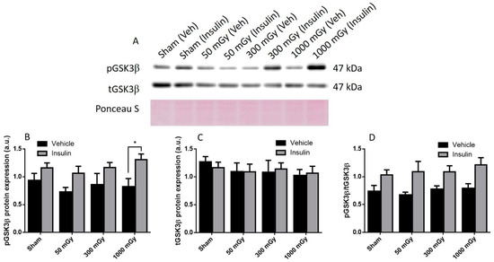 Offspring underwent PET imaging at 16–20 weeks of age to measure glucose uptake. There was no significant difference in cardiac glucose uptake between male offspring exposed to different doses of IR in utero (Figure 1A–C). In the female offspring, the 1000 mGy group had significantly higher cardiac glucose uptake than all three other groups (Figure 1B,D). The heart primarily converts glucose to glycogen and stores it for when the heart needs a burst of energy [37]. We therefore determined if glucose uptake resulted in increased glycogen stores. Glucose storage as glycogen in male offspring was significantly lowered in 50 mGy and 300 mGy IR groups compared to Sham (Figure 2A). Glycogen was significantly increased in the 300 mGy and 1000 mGy groups compared to both Sham and 50 mGy female offspring (Figure 2B). Following insulin stimulation, phosphorylation and expression of Akt and GSK3β signaling proteins were measured to determine if insulin signaling was affected by IR. The presence of insulin can influence the amount of glucose being taken up in the heart [50,51]. Between radiation groups, phosphorylated Akt at SER473 (pAkt), panAkt (total Akt), and the ratio of pAkt/panAkt were not changed in the male heart tissues (Figure 3A–C). Insulin increased pAkt compared to the vehicle injection only in the Sham group (Figure 3A). In female offspring heart tissues, pAkt was only significantly increased in the 1000 mGy group compared to 50 mGy when insulin stimulated (Figure 4A) as well as compared to its respective vehicle group. panAkt and the ratio of pAkt/panAkt were not altered from fetal IR exposure (Figure 4B,C). Phosphorylated and total GSK3β protein expression was not significantly changed in either male or female heart tissues (Figure 5 and Figure 6). Insulin only increased pGSK3β in the 1000 mGy group compared to vehicle injection (Figure 6A).