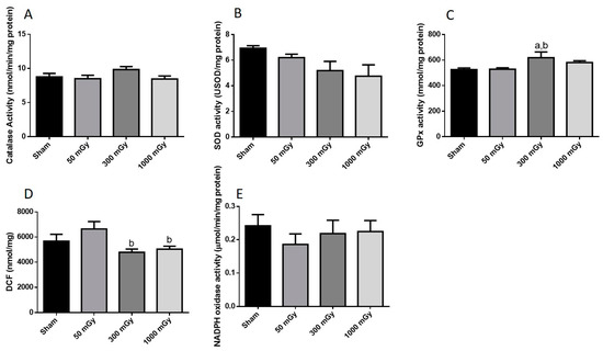 Antioxidant and oxidative stress status. Enzyme activity of the antioxidants (A) catalase, (B) superoxide dismutase (SOD), and (C) glutathione peroxidase (GPx); and (D) total reactive oxygen species expressed as mmol/mg of DCF; and (E) NADPH oxidase activity in male offspring heart tissues. Data are presented as a mean ± SEM. a—is significantly different than control, and b—is significantly different than 50 mGy, p ≤ 0.05. n = 11–13 except (E), n = 7–13 per group.