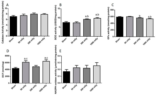 Antioxidant and oxidative stress status. Enzyme activity of the antioxidants (A) catalase, (B) superoxide dismutase (SOD), and (C) glutathione peroxidase (GPx); and (D) total reactive oxygen species expressed as mmol/mg of DCF; and (E) NADPH oxidase activity in female offspring heart tissues. Data are presented as a mean ± SEM. a—is significantly different than control, b—is significantly different than 50 mGy, and c—is significantly different from 300 mGy, p ≤ 0.05. n = 11–19 except (E) where n = 8–9 per group.