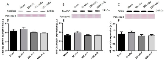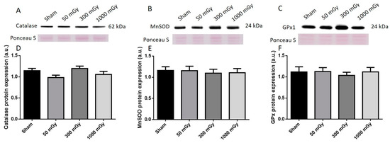 IR has been shown to increase the production of ROS, which can lead to the damage of proteins and DNA [26]. Oxidative stress is also associated with metabolic dysfunction, and studies have shown that oxidants can result in impaired insulin mediated glucose uptake [52]. Endogenous antioxidant activity was measured to determine if prenatal exposure to IR during the last trimester would induce an adaptive antioxidant response to the expected increase in ROS. Catalase and SOD enzyme activities were not altered due to prenatal IR exposure in male offspring (Figure 7A,B). GPx activity was increased in the 300 mGy group compared to Sham and 50 mGy groups (Figure 7C). Total ROS level was decreased in the 300 mGy and 1000 mGy groups compared to the 50 mGy group in male offspring (Figure 7D). NADPH oxidase (one of the major sources of ROS) activity was not changed due to IR exposure in any of the groups (Figure 7E). In female offspring, catalase activity was not altered by IR exposure (Figure 8A). SOD activity was significantly increased in the 300 mGy and 1000 mGy groups compared to the Sham and 50 mGy groups (Figure 8B). GPx activity was significantly reduced in the 300 mGy group compared to the 50 mGy group, and the 1000 mGy group was significantly reduced compared to the Sham and 50 mGy groups (Figure 8C). Total ROS level was increased in 50 mGy and 1000 mGy groups compared to the Sham and 300 mGy groups (Figure 8D). NADPH oxidase activity was not significantly increased after IR exposure but did seem to have a trend to increase as IR dose increased (Figure 8E). Redox ratio measured as GSH/GSSG was used as a marker of oxidative stress where an increase in the ratio indicates increased oxidative stress and vice versa. In male offspring, there was no significant change in reduced or oxidized glutathione levels or the redox ratio (Table 2). In female offspring, GSSG was significantly increased in 300 mGy group compared to Sham (Table 2). GSSG was also significantly increased in the 1000 mGy group compared to all other groups (Table 2). GSH/GSSG was significantly decreased in the 300 mGy group compared to Sham and 50 mGy groups, and the 1000 mGy group was significantly different from all other groups (Table 2). Altered antioxidant enzyme activity was not accompanied by a change in the antioxidant protein expression in either male or female heart tissues (Figure 9 and Figure 10).