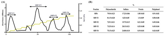 Preparation and chemical composition of SBPs and SBP fractions. (A) Sulfated polysaccharides purified by DEAE-cellulose anion-exchange chromatogram and (B) chemical composition of the total SBPs and SBP fractions.