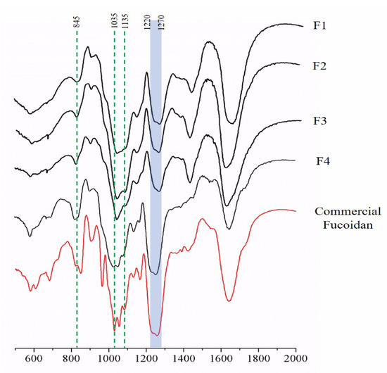 To characterize the structural properties of polysaccharides, we used the 400–2000 cm−1 wave number range of the FTIR spectra covering the fingerprint region of polysaccharides. The FTIR spectra showed prominent peaks at 845, 1035, and 1616 cm−1, and a broad peak between 1220 and 1270 cm−1 in the SBP fractions and the commercial fucoidan (Figure 2). Glycoside bonds between multiple monomers to form polysaccharides were observed at 1000–1100 cm−1 (C–O–C stretching vibrations). The strong absorption band at 1220–1270 cm−1 confirmed the significant amount of sulfate in the fractions and commercial fucoidan. For each fraction, the intensities of most peaks were similar in all spectra, but a definite difference was observed for the intensity of 1220–1270 cm−1. The peak identified at 1200 cm−1 corresponds to sulfate stretching vibrations [44], and the results suggest that sulfate-content-wise, SBP-F4 has a strong similarity to commercial fucoidan.