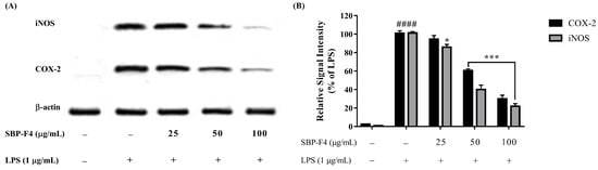 LPS induces NO production by stimulating inflammatory responses in macrophages. As illustrated in Figure 3A, the production of NO decreased in a dose-dependent manner upon treatment with SBP fractions. The fractions close to F4 exhibited inflammation-inhibitory activity, and cell viability increased in response to co-treatment with LPS and SBP fractions (Figure 3B). The inhibition of iNOS and COX-2 proteins by SBP-F4 was evaluated by Western blot analysis (Figure 4A). The iNOS and COX-2 protein expression levels decreased in a dose-dependent manner in response to SBP-F4 treatment (Figure 4B). Hence, these results clearly show the anti-inflammatory potential of SBP-F4.