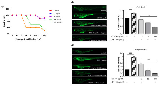 Effect of SBP-F4 on survival rate, LPS-induced cell death, and NO production in zebrafish larvae. (A) After fertilization (7–9 h post fertilization (hpf)), zebrafish embryos were moved to a 12-well plate. The embryos were pretreated with various concentrations of SBP-F4 (25, 50, 100, and 200 µg/mL) and compared to the untreated control group. The survival rate of zebrafish larvae was 168 hpf after treatment. Inhibitory effects of SBP-F4 on LPS-induced cell death (B) and NO production (C) in zebrafish larvae. The fluorescence intensity of individual zebrafish larvae were quantified using ImageJ software. Experiments were performed in triplicate; data are expressed as the mean ± SE. p < 0.05 and *** p < 0.001 compared to the LPS-treated group (10 µg/mL) and ### p < 0.001 compared to the control group (nontreated SBP-F4 and LPS).