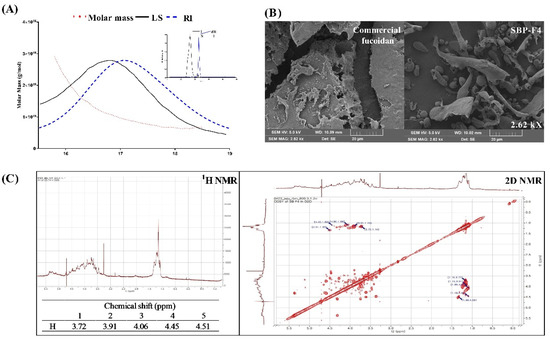 Identification and characterization of SBP-F4. (A) GPC-RI-MALS profile of SBP-F4, (B) morphological properties of commercial fucoidan and SBP-F4 as identified using SEM, and (C) 1H and 2D NMR spectra of SBP-F4.