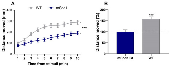 SOD1 G93R mutant locomotor activity. (A) The distances that 6 dpf WT and mSOD1 larvae swam following light stimuli per 1 min time bin were measured and averaged (*** p < 0.001; linear mixed effect model; n = 48/group). (B) The change (%) in the distance that the WT larvae swam compared to mSod1 larvae. The distances were averaged per fish for the whole 10 min period following light stimuli, scaled per plate and compared between conditions (*** p < 0.001; linear mixed effect model; n = 48/group).