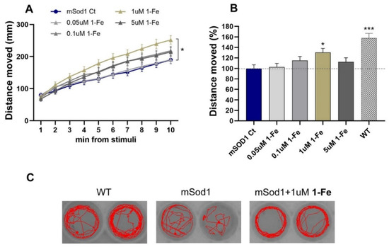 Further efficacy analyses revealed that treatment with 1 μM 1-Fe significantly improved locomotion in mSod1 G93R larvae (p < 0.05; Figure 2A). Comparison of the effects of the treatments on mSod1 fish motor abilities, averaged for the whole 10 min period, revealed that treatment with 1 µM 1-Fe induced a significant increase of 30.5% in locomotor activity of mSod1 larvae (p < 0.05; Figure 2B,C). SOD1 mutants treated with the lower applied concentration of 0.05 µM and 0.1 µM 1-Fe or higher concentration of 5 µM 1-Fe showed a lesser, non-statistically significant increase in their swimming ability (2.7, 15.2 and 12.4%, respectively), forming a bell-shaped dose-response curve (Figure 2B).