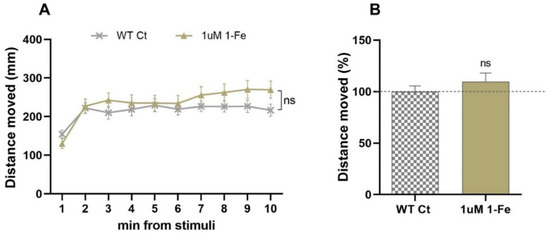 1-Fe treatment did not affect motor activity of WT larvae. (A) The distance vehicle-treated (0.1% DMSO; Ct) or 1 μM 1-Fe-treated WT larvae swam, per time bin of 1 min following light stimuli was averaged (ns = non-significant; linear mixed effect model, n = 48/group). (B) The change (%) in the distance the WT-treated larvae swam compared to their vehicle-treated WT counterparts. The distances swam were averaged per larva for the whole 10 min following light stimuli, scaled per plate and compared between treatments (ns = non-significant; linear mixed effect model, n = 48/group).