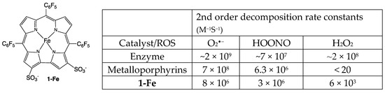 The structure of the corrole-based catalytic antioxidant 1-Fe and a comparison of its ROS decomposition rates relative to those of the natural enzymes (SOD for O2•− and catalase for H2O2) and porphyrin-based metal (Mn or Fe) complexes [28,29,30,31].